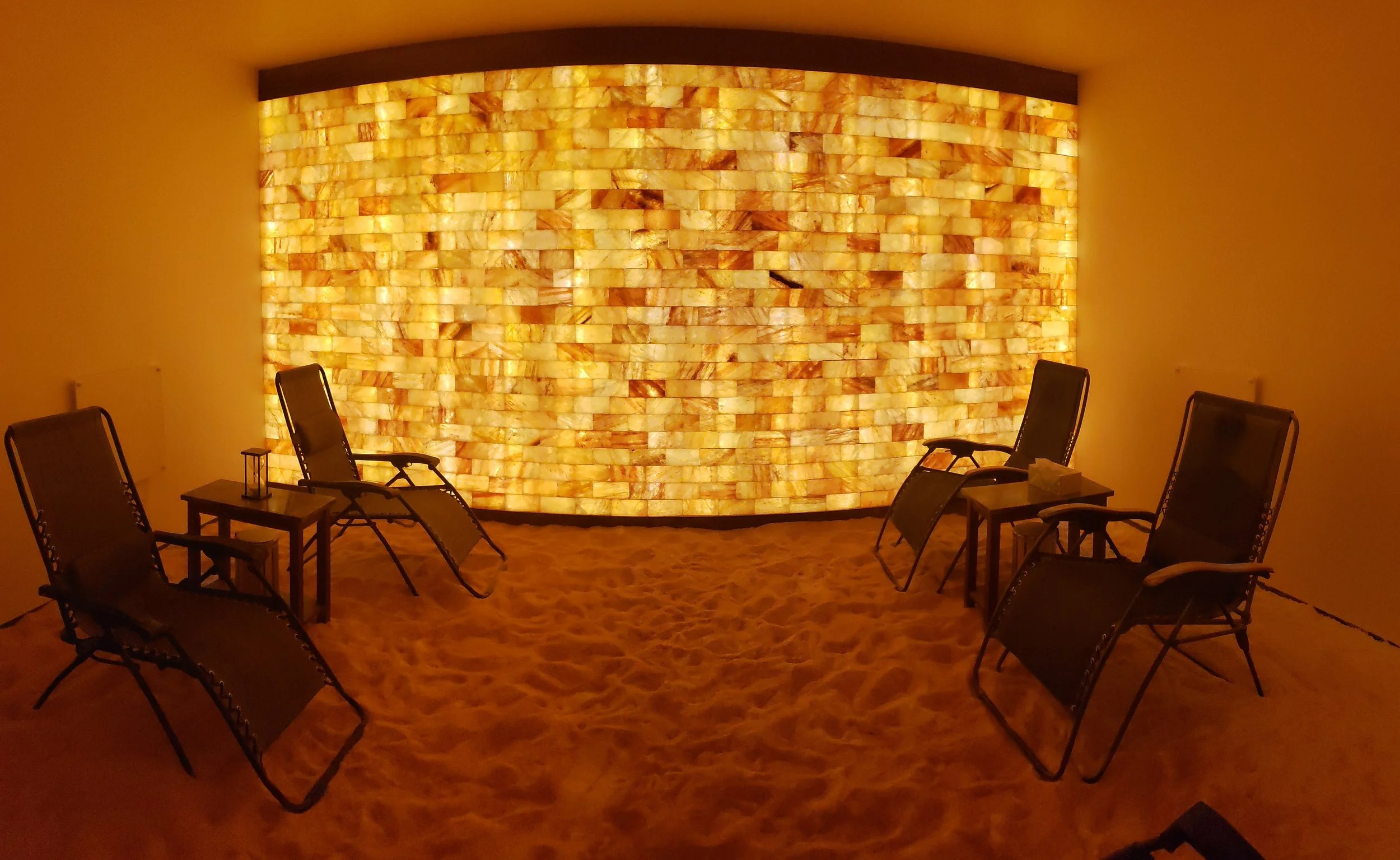 As you enter the room, you are greeted by the ambient glow of Himalayan salt bricks, beautifully back lit to create a calm and soothing vibe, creating the back wall to your personal cave. As you take your first steps, the feeling of sand-like salt granules conforms to your feet and transports you to a beach oasis. As you breath in the salty air, your airways clear and you feel your worries and respiratory aliments melt away.